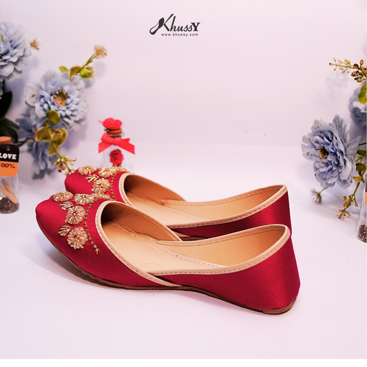 Discover our regal Luxury Bridal Khussa made from premium satin fabric. Featuring maroon color, delicate gold embroidery, floral embellishments, and beadwork for a touch of elegance.